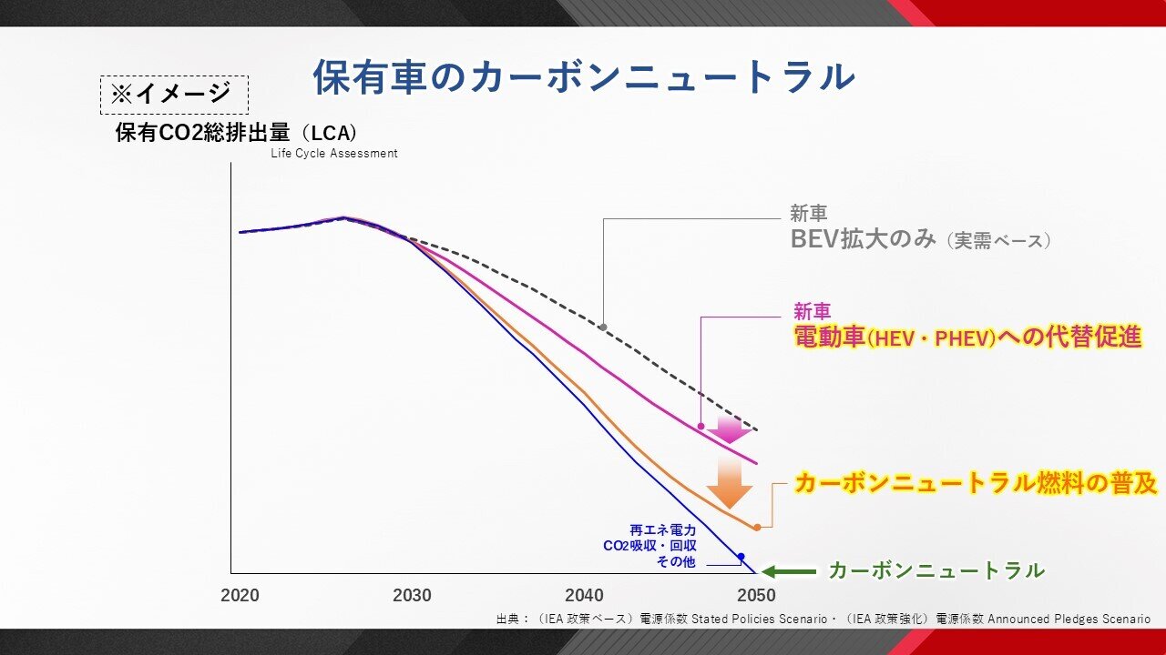 保有車のカーボンニュートラルという観点では、今すぐCO2を減らせるハイブリッド車を軸に、環境性能の高いモビリティへの代替を促進すること、そして、カーボンニュートラル燃料の普及を加速させていくことが重要であると考えています。