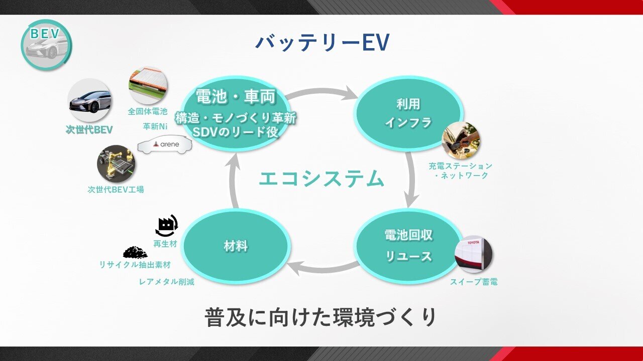 バッテリーEVの普及に向けては、車両や電池の技術革新に加えて、電池の材料調達から回収・リユースまで、電池のエコシステムをつくっていく必要があると考えています。