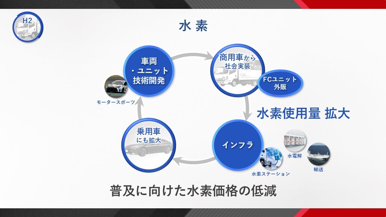ユニットの外販も含めて商用車で水素モビリティの社会実装を加速していくことで、水素の使用量を増やし、コストの低減とインフラの拡充につなげていきたいと思います。