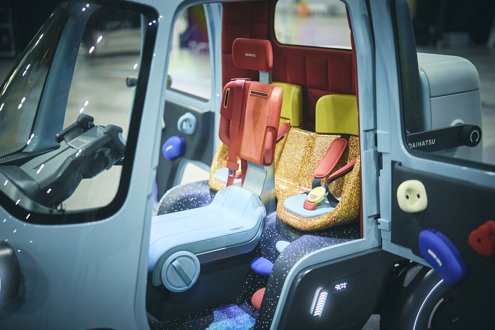 運転席の後部に、乳幼児ほどの小さな子どもが座れるシートを2つ並置した1+2シート。小さな子どもも乗り降りしやすいドアは前開き。