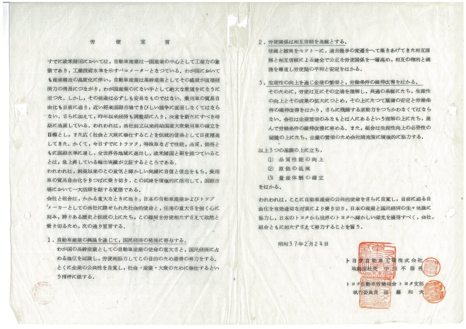 労使一体となって、この難局を乗り越えて、日本のトヨタから世界のトヨタへ飛躍していこうとそんな決意を明文化したのが、労使宣言でした。ぜひ原文を改めて皆さんにお読みいただきたいと思います。