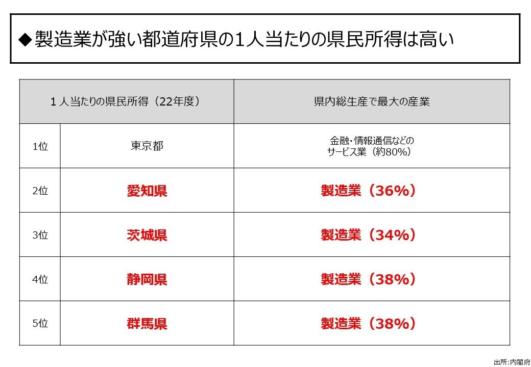 都道府県別に見た1人当たりの所得では、トップの東京の後に愛知、茨城、静岡、群馬と続く。これはサプライチェーンも含めた自動車産業がある地域だとして、日本がモノづくり大国、製造業の強い国であることを示した。