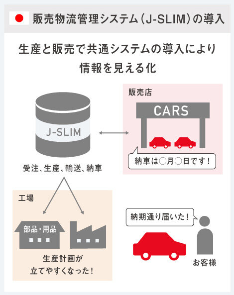そこで、新たに国内では、J-SLIMという、メーカーと販売店が同じ情報を管理できるシステムを導入しました。具体的には、お客様が販売店で注文をいただいた瞬間からメーカーの方に情報が飛んできます。