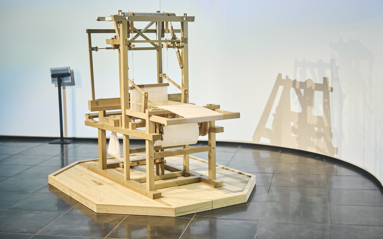 豊田佐吉がつくった木製織機。これは苦労して機を織る母親を楽にしてあげたいという想いから佐吉が発明したもの。
