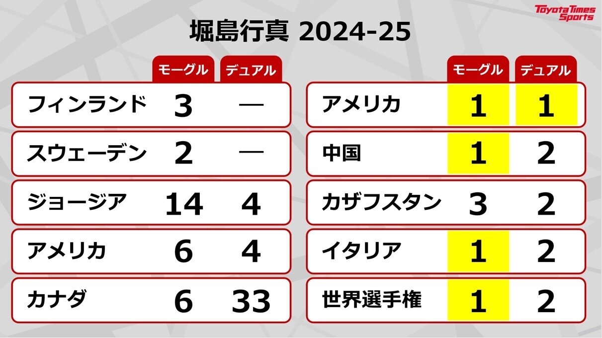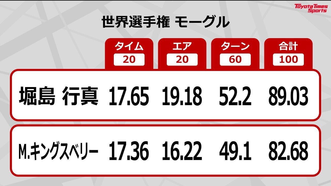 今季の堀島選手を振り返ると、シーズンを通して戦うワールドカップの前半はなかなか表彰台に上がれなかったが、後半戦に盛り返して総合2位。そして最後の大一番となる世界選手権では、種目別モーグルで圧倒的な強さを見せて優勝した。2人の選手が同時に滑る種目別デュアルモーグルは準決勝で負傷したために、決勝に進出したものの全力で滑らないことを選択し、銀メダル。惜しくも2冠を逃してシーズンを終えた。