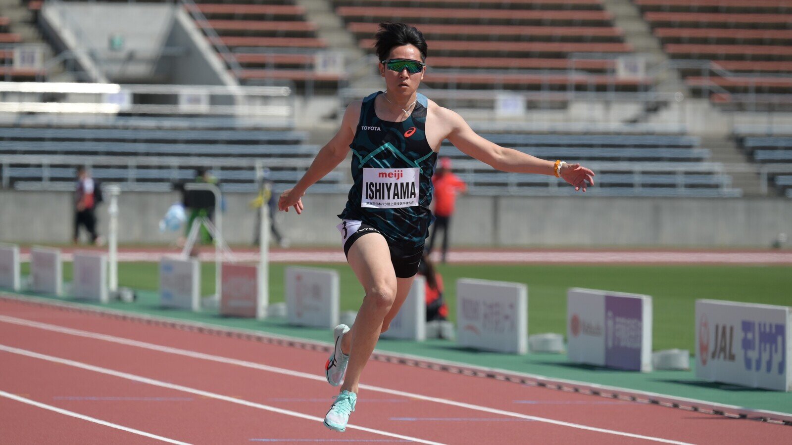 前日の走幅跳に続き100m(T12)に出場の石山選手は、予選で自己ベストに迫る記録を出し、決勝でも後半で他の選手をグングン引き離す快勝。11秒22の日本新記録であることがアナウンスされると、石山選手はドヤ顔で両手を広げて観客にアピールした。