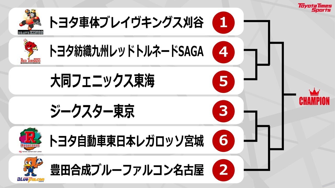 リーグHは14チームで争ったレギュラーシーズンの結果、プレーオフに進む6チームが決定。4年連続で悔しい想いをしてきたトヨタ車体ブレイヴキングス刈谷が1位、王者の豊田合成ブルーファルコン名古屋が勝ち点1差の2位で、再び決勝で激突する機運が高まっている。
