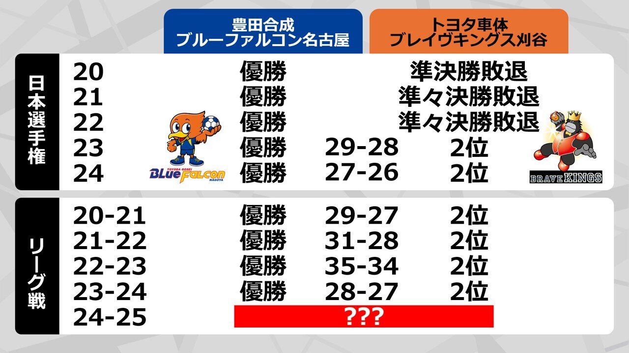 これまでのリーグ戦では、トヨタ車体が2018-19シーズンに優勝。20-21シーズン以降は豊田合成が圧倒的な強さで4連覇をしているが、そのファイナルの相手は全てトヨタ車体で、点差は1点から3点という接戦だった。