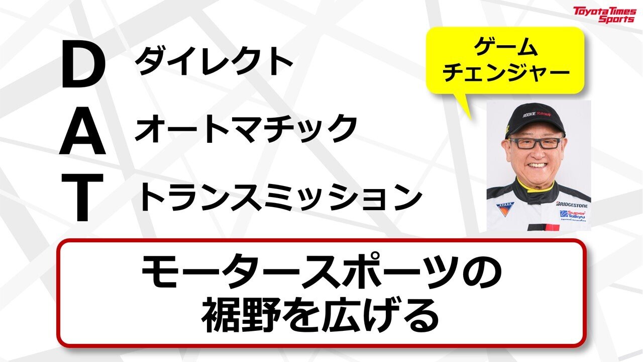 DATとは「ダイレクト・オートマチック・トランスミッション」の略。MT(マニュアル)と同じような最適なシフトチェンジを可能にすることができ、モータースポーツやドライビングの可能性を広げることが期待される。モリゾウも「ゲームチェンジャー」と表現している。
