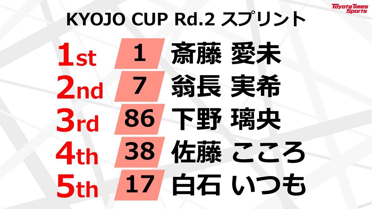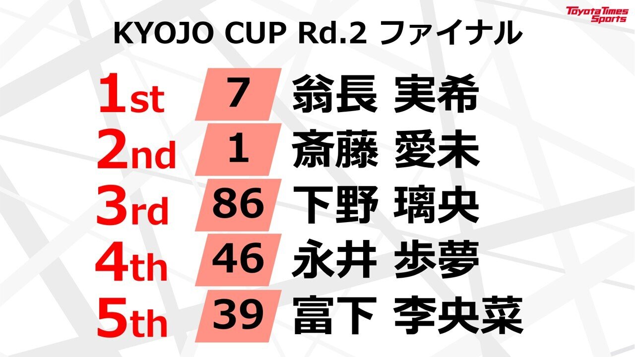 続くKYOJOのファイナルでは、前日に続いて斎藤選手と翁長実希選手、下野璃央選手による三つ巴の激しいレース。レース途中に入ったセーフティカーが抜けて、レースが再開されるタイミングで逆転を許し、斎藤選手は2位に終わった。