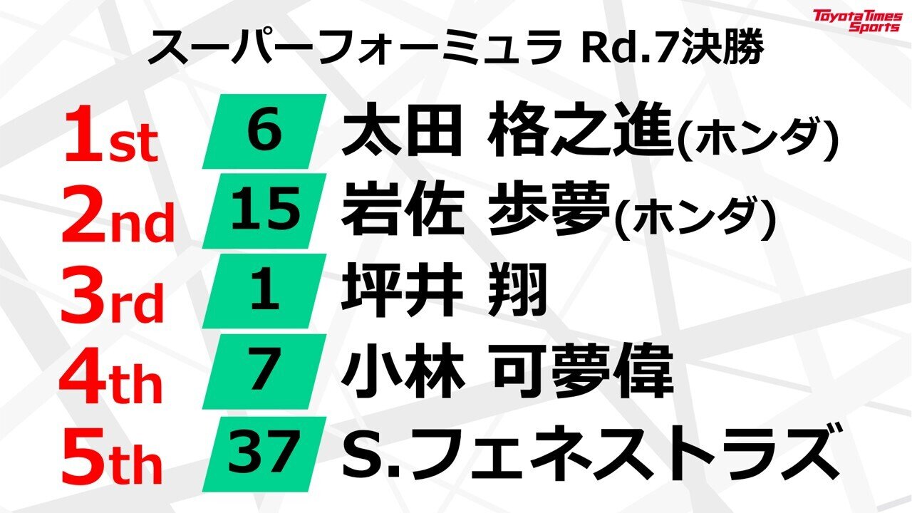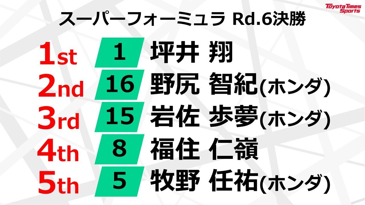 自身の決勝直前、妻の走りについて「元々フォーミュラの歴が少ないので、僕的には2戦目にしては上出来。悔しさは残っていると思いますけど、その悔しさは僕が晴らせるように頑張ります」と話していた坪井選手。スタートで出遅れ、すぐにトップを奪い返す激しい走りを見せた。ホンダ勢とのバトルが続く中で健闘したが、レース中盤、トップを奪われて3位と何とか表彰台を死守した。