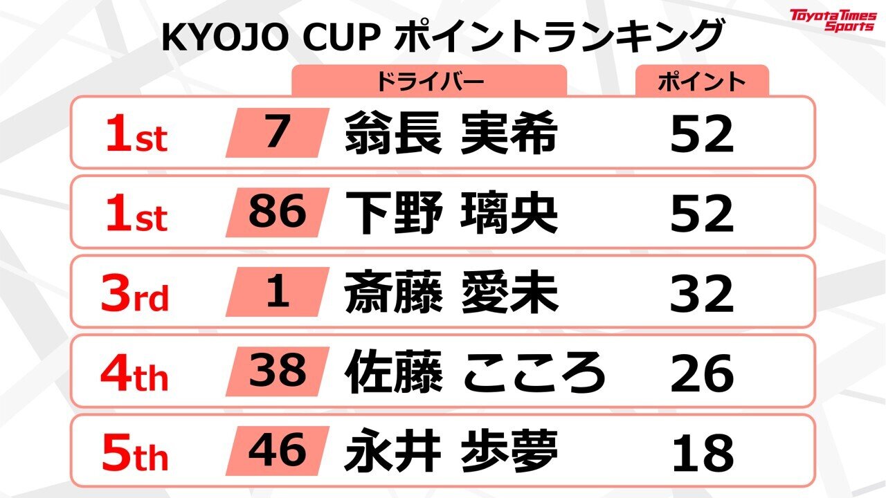 KYOJO CUPは第2戦を終え、翁長選手と下野選手が同ポイントでランキングトップ。昨年のチャンピオン斎藤選手が3位に上がってきて、全5戦のシリーズが俄然面白くなってきた。