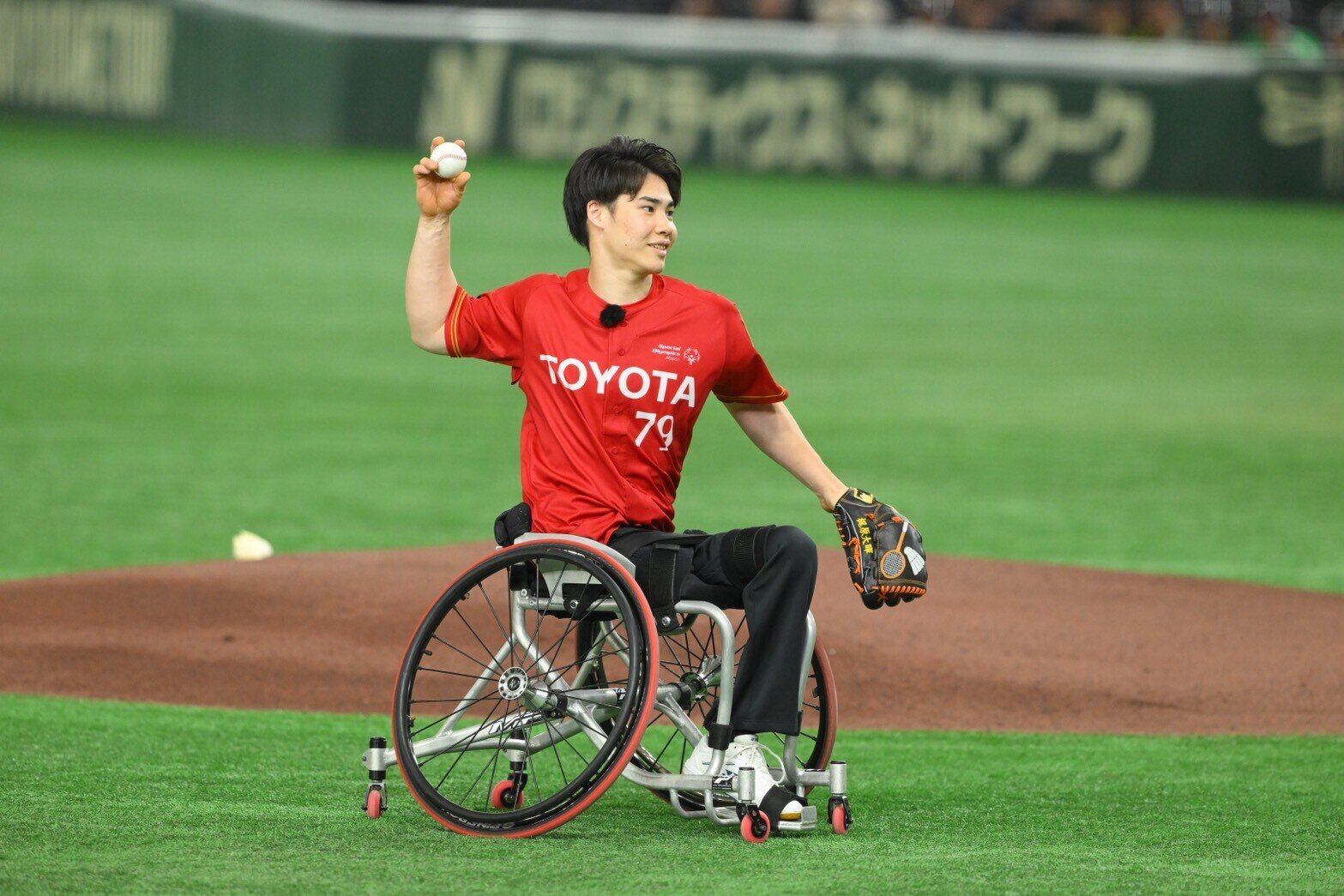 車いすに座ったまま力強く投じられた一球は、見事なストライク。金メダリストの速球にスタンドがどよめいた。梶原選手は「貴重な経験をさせていただきました。なんとか野球部の皆さんにいい流れをつなぎたいなと思って」と、大役を終えてホッとしていた。