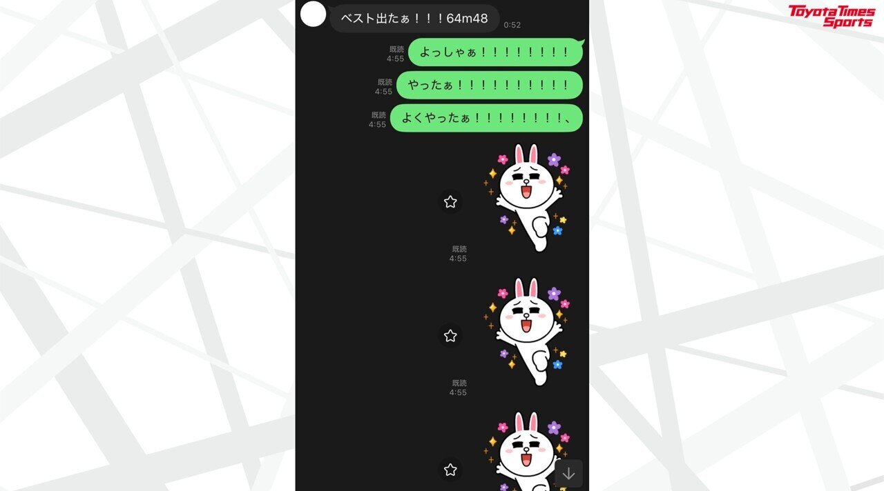 今年は実に7年ぶりとなる自己ベストをマークし5年ぶりに日本記録を更新、LINEでも日本時間の早朝に祝福するやりとりをした。明夏里さんは「7年間彼が1日もサボらずにずっと努力している姿をとなりで見てきたので、結果が出てくれて良かったと安心しました」と笑顔を見せた。