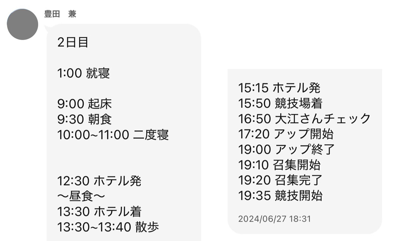 そんな豊田選手の「#となり目線」は「勝手にスケジュールを送ってくる」。通常は選手がコーチに送ってくるスケジュールは召集やアップの時間ぐらいだが、豊田選手は起床や朝食、二度寝の時間まで細かく連絡してくるそうだ。