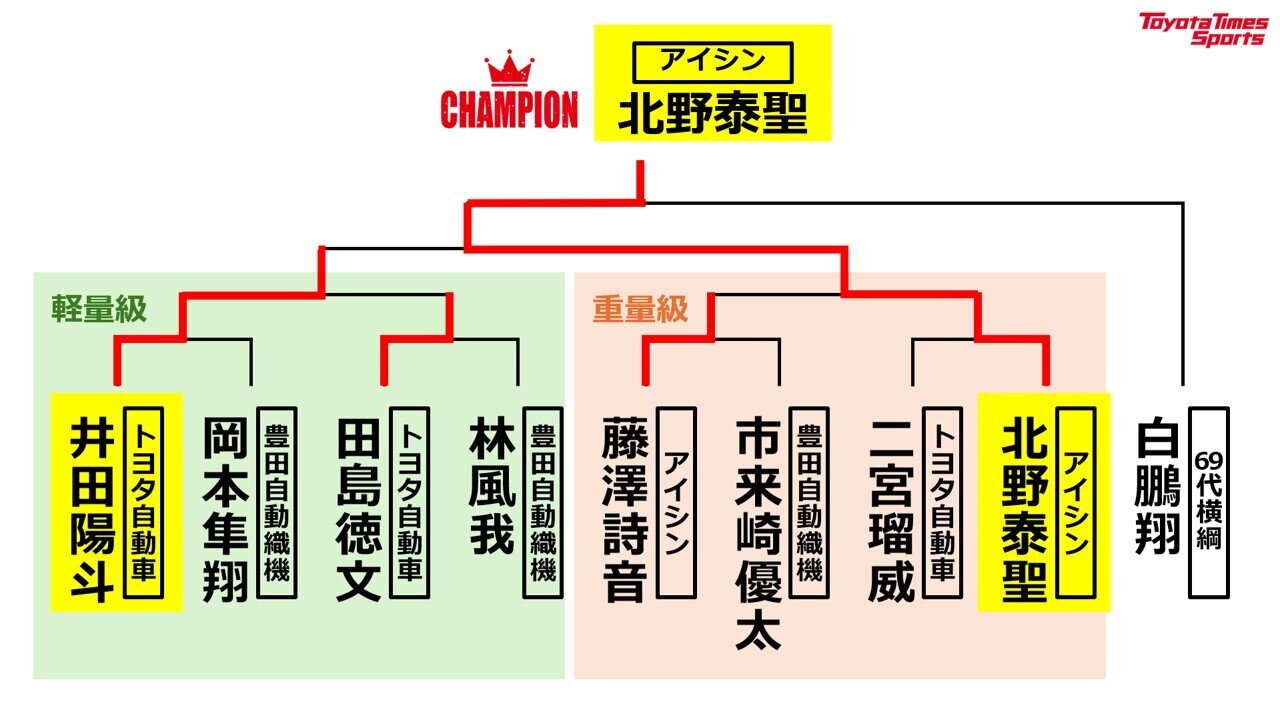 特別にトヨタグループ対抗の体重別相撲選手権が開催されることになり、軽量級の決勝では、トヨタ自動車の井田陽斗選手が土俵際で勝利。重量級は、アイシンの北野泰聖選手が優勝した。女子の決勝は、トヨタ自動車の新井田未徠選手がうまくタイミングを外し相手を投げ出すと、白鵬さんとハイタッチ。