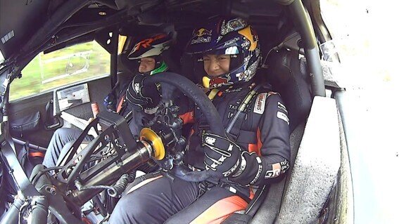 コ・ドライバーのアーロン・ジョンストンはオイルを口に含んで排出するなど、献身的なセルフリペアで自走可能なまでリカバーに成功。しかし、その後の切り返しの多いテクニカルセクションでは、歯を食いしばりながらステアリングを操作する勝田選手の奮闘ぶりが国際画像にも映し出されていた。