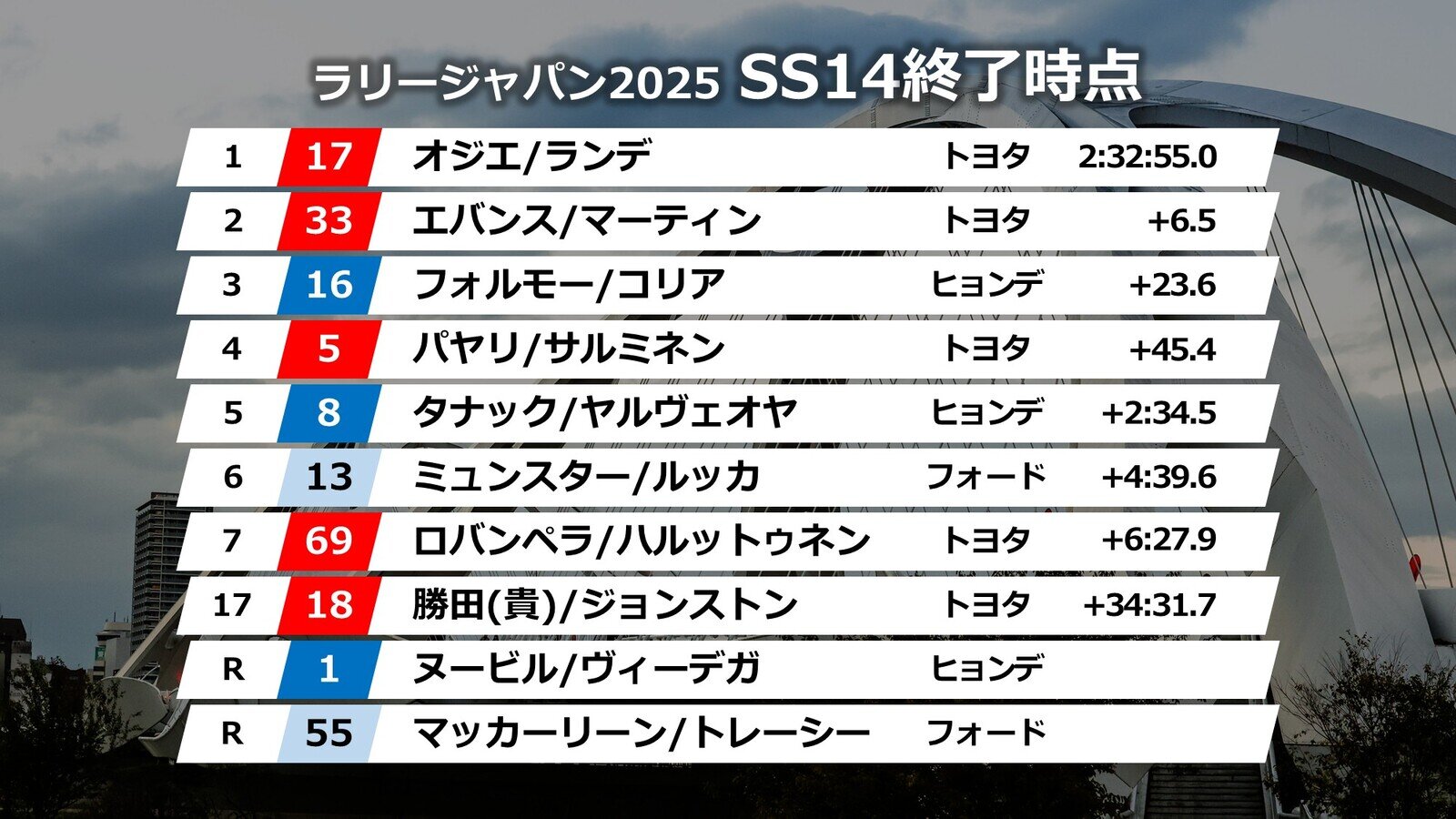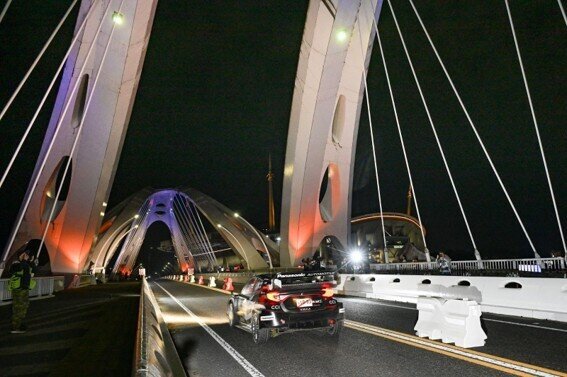 DAY-3最大の見どころは、スカイホール豊田を飛び出し市街地を走り抜け、豊田大橋を駆け降りてゴールするナイトステージの「SS14豊田市SSS」。勝田選手も待ちわびるファンのため応急処置を施したマシンで出走した。