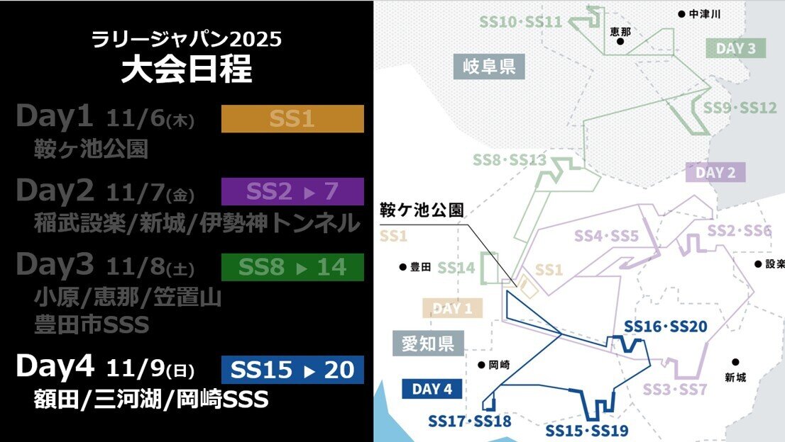 「SS9/SS12恵那」「SS10/SS11笠置山」で岐阜県内を進み、「SS14豊田市SSS」で愛知県に戻るという4つのコースを走るルート。詳細は山田啓介選手によるSS耳より情報 を確認しよう。