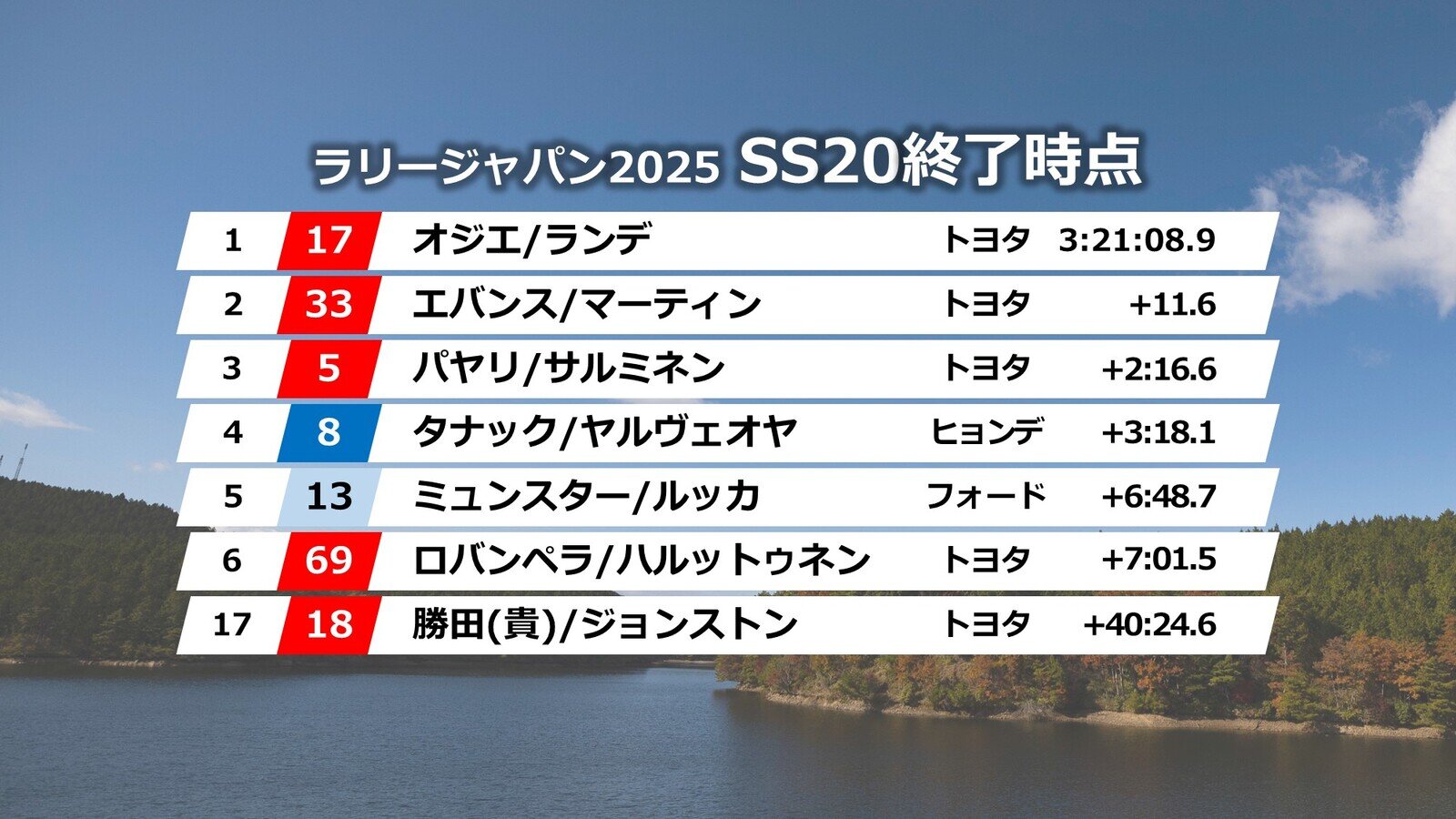 「SS20三河湖パワーステージ」の終了後、暫定表彰式が行われた。総合優勝はスーパーサンデー、パワーステージの全てを制するパーフェクトウインを達成し35ptを追加したオジエ選手がトータルタイム03:21:08.9で獲得し、ラリージャパンでは初優勝。2位はエバンス選手、そして3位に若手のパヤリ選手が入り初の表彰台。トヨタが表彰台を独占した。
