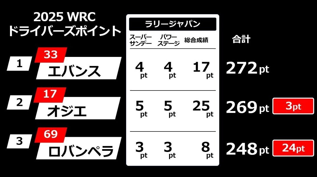 気になるドライバーズタイトル争いは、エバンス選手(272pt)とオジエ選手(269pt)の順位に変動はないものの、その差はわずか3pt。ロバンペラ選手も24ptビハインドと差は開いたものの、展開によっては可能性が残る状況で最終戦の14戦ラリー・サウジアラビアに持ち越される結果となった。