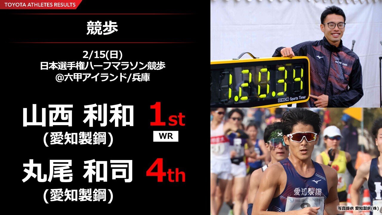 両選手は2018年のアジア競技大会や東京2020オリンピックを経験しており、愛知・名古屋2026の選考会となる2月の日本選手権ハーフマラソン競歩に出場。山西選手は1時間20分34秒の世界新記録で優勝し、丸尾選手も4位に入った。