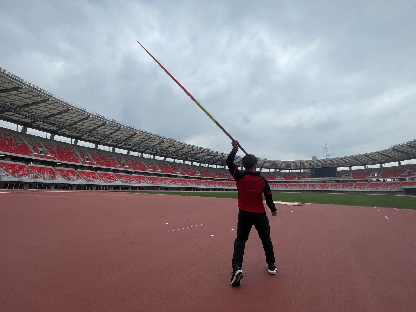 最後は、完成したグラウンドに降りたっての中継。4人の選手たちはスタジアムの雰囲気や地面のタータンを感じ、今にも駆け出したくてうずうずしている様子だ。高橋選手に至っては、やりを持って助走のシミュレーションを演じてみせた。