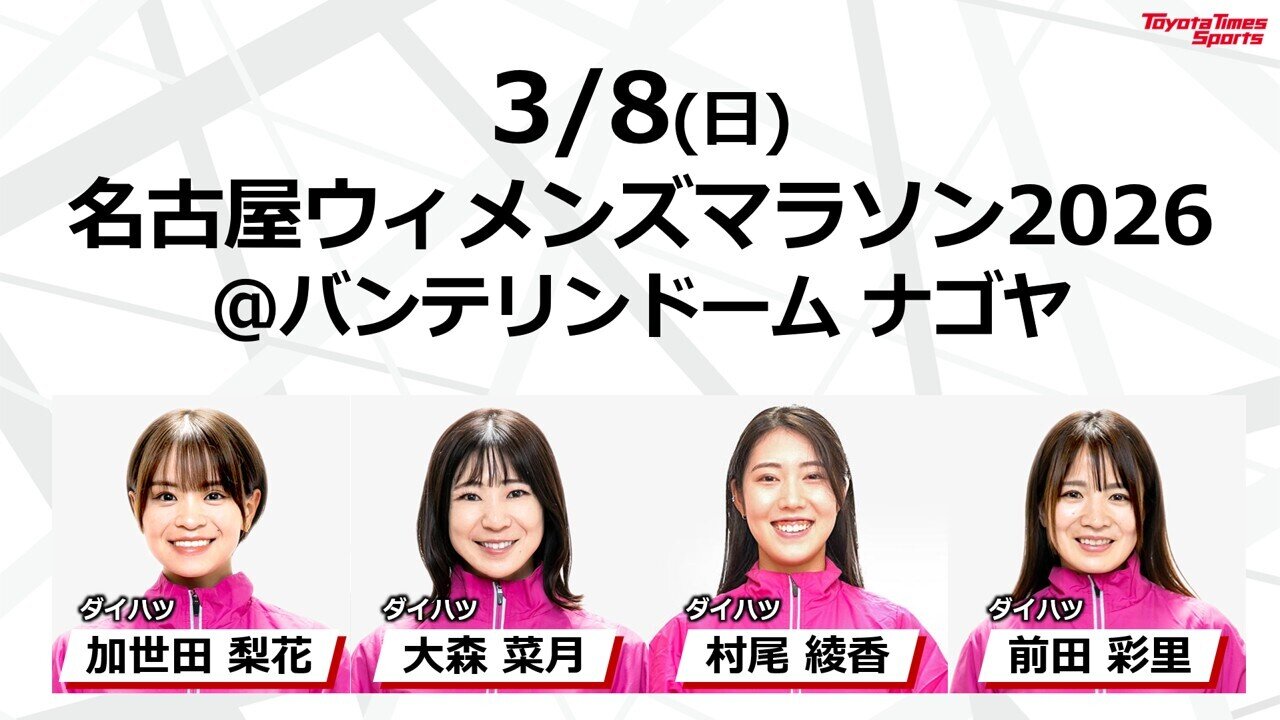 初登場となるダイハツの陸上競技部からは、加世田梨花選手、大森菜月選手、村尾綾香選手、前田彩里選手がコメント。4選手は3月8日に行われる名古屋ウィメンズマラソンに出場予定で、トヨタイムズスポーツのアプリでも応援メッセージを募集している。選手らのメッセージは34:17から。