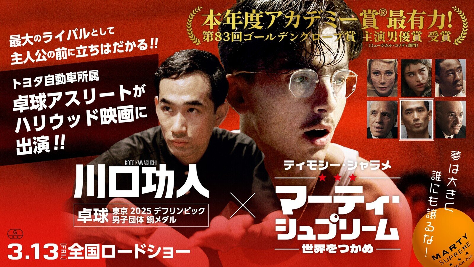 3月13日のトヨタイムズスポーツは、デフ卓球の川口功人選手が出演し、アカデミー賞9部門にノミネートされた映画『マーティ・シュプリーム 世界をつかめ』の公開を記念した特別企画。