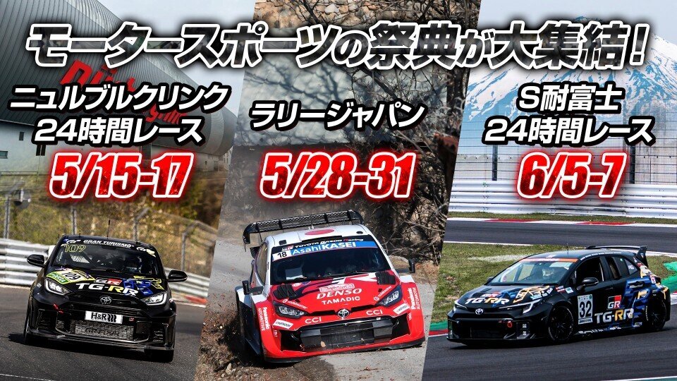 ニュルブルクリンク24時間レースは5月15~17日、ラリージャパンは5月28~31日、S耐富士24時間レースは6月5~7日に開催。もちろんトヨタイムズスポーツでも生中継を予定している。道が人を鍛え、クルマを鍛えるドラマは、貴元選手が新たなストーリーを紡ぎ出した。その続きを見届けよう!